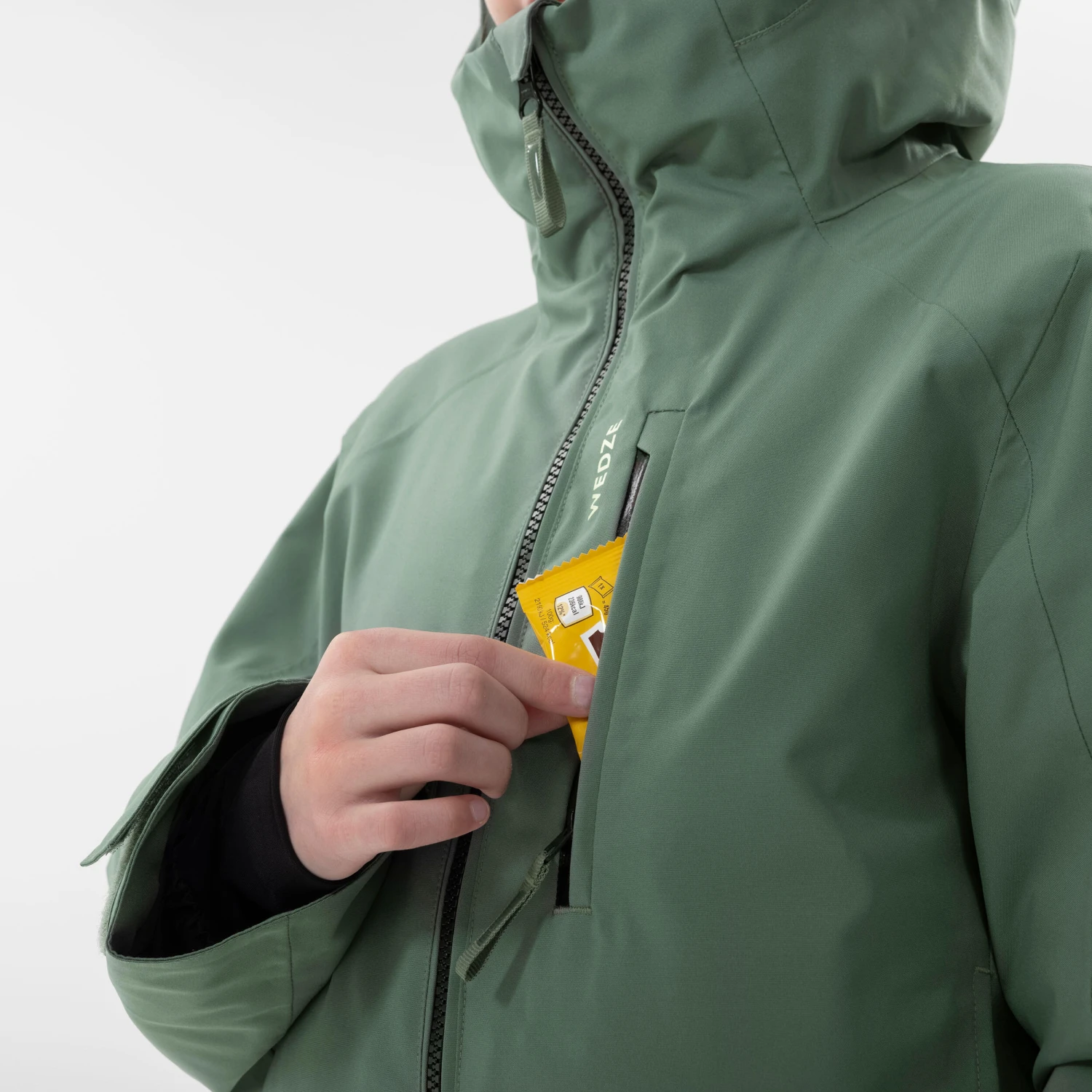 Our team, parents of young skiers, has developed this ski jacket to support kids on the slopes, even on the snowiest days.With 100% taped seams, this jacket is perfect for full days of skiing, whatever the weather! The snow skirt adjusts automatically when the jacket is fastened.